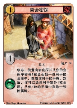 :横置商会密探并从你的金库中转移1枚金币到一位对手的金库中,查看该对手的手牌。然后,你可以给该对手额外1枚金币,从他/她的手牌中弃除一张附属牌。